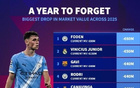 25年德转身价跌幅前10:福登跌6000万最高,维尼修斯跌5000万